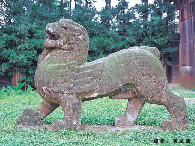石獸和戰國時的青銅翼獸有繼承的關系,形狀上多似龍虎又如獅,全身從頭到尾仍有那起伏流轉的強健線條。漢代從西域傳入的獅子因為其勇猛而成為吉祥之獸,受到歡迎,石雕自然要和龍虎結合為一了。當然,也有造型較明顯的石獅子。